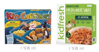 ディナー製品でも子供用製品がある。冷凍ディナー製品ではConAgra社が “Kid Cuisine”(写真13) のいわゆるTYディナー製品を出している。これには保存料などが一切使われていない。またKidfresh社は自社名ブランドで子供用の冷凍ミール製品を数種類出している。この “Spaghetti Loops – Pasta’n Meat Sauce” (写真14)にはピューレにした野菜が使われており、野菜をしっかり摂取できるようにしている。勿論、この会社の製品には添加物や合成色素が一切使用されておらず、更にはその原料についても、ホルモン、抗生物質などが一切使われていないものを使用している。